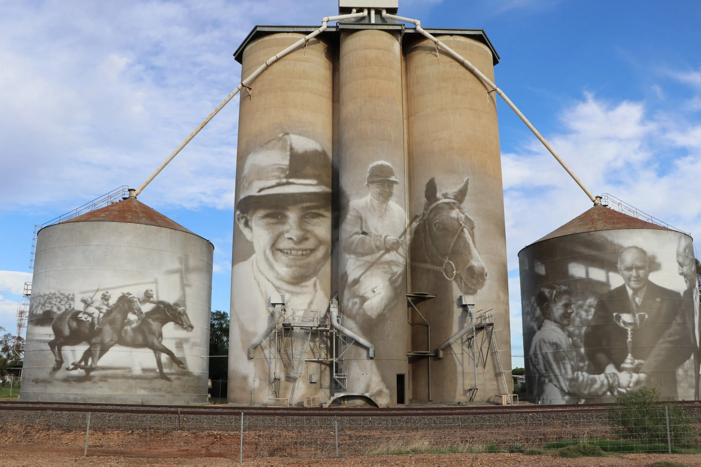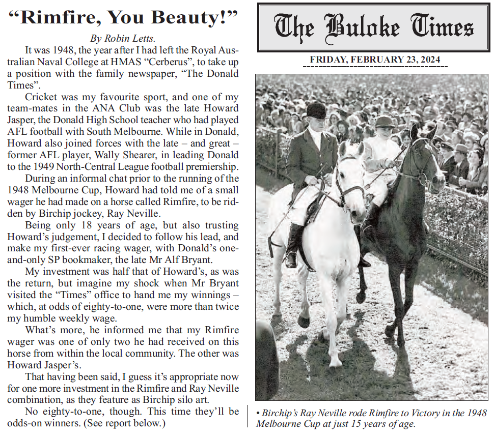 A proud piece of Birchip’s history now stands tall above the town, capturing the unforgettable story of local jockey Ray Neville and his remarkable Melbourne Cup victory aboard Rimfire.