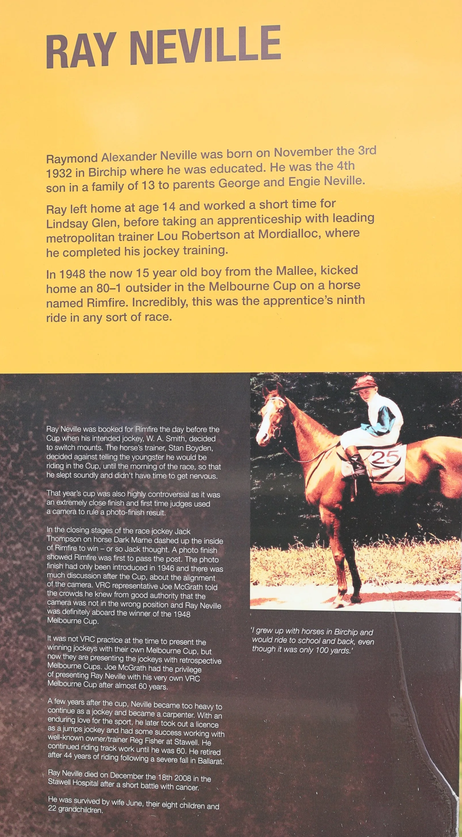 In 1948, Neville was just 15 years old, with only a handful of race rides to his name, when he secured a last-minute opportunity to ride Rimfire. Starting at odds of 80 to one, he was given little chance against a field of seasoned jockeys.